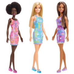 These Barbie® dolls take imaginations away wearing unique dresses with colorful tie-dye prints. A matching pair of shoes adds another bright pop of color. Choose from dolls with unique looks and a variety of skin tones, eye colors, hair colors and styles. Kids can tell all kinds of stories, from day to night, because when a girl plays with Barbie®, she imagines everything she can become! Each sold separately, subject to availability. Dolls cannot stand alone. Colors and decorations may vary.