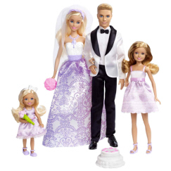 Lovers of love can imagine their dream wedding with this Barbie wedding gift set! Four beautiful dolls include a bride, groom and two bridesmaids, plus wedding-themed play pieces to celebrate the festive occasion. Barbie doll is ready to walk down the aisle in a gorgeous gown, Ken doll looks dapper in a classic black and white tuxedo and bridesmaids Stacie and Chelsea dolls celebrate in style with coordinating lavender looks fit for big sister's big day. Flower bouquets and the included wedding cake tie it all together and help kick off what's sure to be a fantastic reception. Dolls cannot stand alone. Colors and decorations may vary.