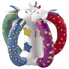 The Sparkling Symphony Ball combines music, lights and motion for an entire musical experience. When baby grabs it or gives it a shake, lights and vibrations move along with the music! Five colorful, soft fabric handles are easy for baby to grasp and clutch. Plays five songs (three classical songs and two children's tunes). Requires 3 "AA" alkaline batteries.