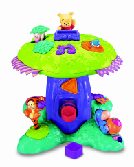 The 1,2,3 Exploring Tree will keep baby engaged and captivated from sitting to crawling to standing. It is loaded with basic infant activities on bottom including a bat at Tigger, Eeyore with a spinning ball, a butterfly with crinkle material and an open and close door which also acts as storage for the play pieces. When baby is able to stand the activities and characters on the top of the tree will reward exploring baby with lights, sounds and music. Piglet plays peek a boo with baby, Kessie will chirp when baby spins the dial. There are three shape play pieces that Baby Pooh will identify when baby put the shapes in the right place. When baby drops any of the pieces in Pooh's picnic basket Pooh will say an adorbale phrase or there will be fun sound effects. When the pieces reach the bottom of the tree Baby Tigger or Baby Eeyore will join in with a cute phrase as well. There is additional sit at play in the tree trunk with basic shape sorting and drop through play.