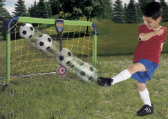 Two levels of fun soccer play encourage and reward developing sports skills! Beginners score fun sounds whenever they kick the ball into the net. The challenge grows along with kids' growing skills - "pros" have to hit the adjustable target to score fun sounds and hear the announcer shout "Goal!"! Includes goal (approx. 2 feet tall x 31/2 feet wide!), plus net, adjustable target, two player score keeper and ball.