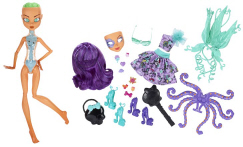 Monsters have feelings too! Customize the emotions of this creepy cool creature, and show it in her eyes. Simply press on the brain to switch between three different expressions. Get even more “touchy-feely” by modifying the monster parts, snapping in different emoticons. Then match the mood on the exterior with a fabulous feeling fashion and clawesome corresponding accessories. A fill-in-the-blank diary is a final, creative inspiration to build a bio and personalize to new scary heights. The Shockingly Shy™ Scared Silly™ set includes one full doll with the eye-changing/brain feature, one interchangeable face plate, a peggable/interchangeable skeleton and chest plate, inner piece count, over-the-top fashion, accessories, purse, doll stand, brush and fill-in-the-blank diary. It's a brand new way to play!