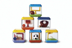 Rolling into the Peek-a-Blocks Discovery Block assortment - this set of 6 sports themed interactive into goal. Golf green has loose ball to roll into hole. Loose Basketball shoots through hoop.
