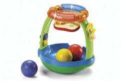 A baby hoops game that magically rewards baby for ball drop play. For the sitting baby the hoop sways on a roly-poly base. As baby tosses one of the 3 soft balls through the hoop, 1 of 3 lively tunes plays while the 2 colored lights dance. The balls swirl around in the base. For the crawling or walking baby, the base flips over to allow the balls to roll free following each "score", encouraging baby to crawl. Built-in activities include a twirling cheetah character on one arm and 2 roller beads on the other. The Ball Toss also connects to the Play Wall as part of the Baby Gymtastics Play System