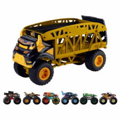 Transport up to 12 Hot Wheels® Monster Trucks with this large-scale Monster Mover vehicle bundle that comes with 6 Monster Trucks for an instant collection! With the flip of a switch, kids launch their trucks into action through the rear ramp. Transport, store and organize kids' collections of 1:64 scale monster trucks with ease and impressive looks -- this truck organizer is designed like Steer Clear™, one of Hot Wheels® most iconic trucks. The hauler also features signature GIANT tires to roll over obstacles. With six cool Monster Trucks included, kids can smash and crash right out of the box! Colors and decorations may vary.