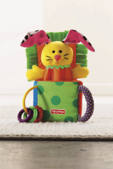 The Fisher-Price Peek & Sqeak Bunny is a great little "jack-in-the-box" format that delights baby with peek-a-boo play. A magnetic closure makes it easy for mom or baby to unlatch the top of the box, and bunny pops up with a surprise squeak. Baby is encouraged to reach for bunny and is rewarded with bunny being able to be fully removed from his box! Developmental black and white patterns on bunny's ears and a cute squeak every time the bunny is compressed grabs baby's attention and encourages baby's movement. Different textures and patterns for baby to explore adorn the bunny's box. One soft handle and one plastic handle with beads encourage baby's interaction while providing easy take along capability so the Pop 'n Play Bunny can go wherever baby goes.