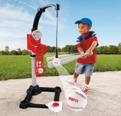 Innovative tee-free design helps kids keep their eye where it should be when they're learning to bat-on the ball, not the tee! This batting trainer makes learning to hit the ball fun and easy-just tap the plate to automatically load a ball. The mechanical arm drops down, picks up a ball, then raises right back to position! Sound effects, baseball "chatter" and ESPN music add to the fun! Height adjustable for peewees to preschool pros. Includes bat and 3 balls. Requires 3 "C" batteries.