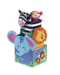 This rainforest themed product consists of three nesting boxes and a monkey squeaker. The largest box is a blue elephant with crinkle ears, and tactile flower and butterfly. The medium-sized boxed is a lion with a soft mane. The smallest box is a zebra with a jingle. A small, soft monkey comes along with the set, and baby will have fun playing put and take with the rainforest friends.