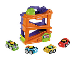 Zig-zag-zoom! Baby places a car on top, and they're off! Zooming down the zig-zag ramps, back and forth to the bottom ... where music and fun sounds greet each vehicle! Two easy-to-hold cars are equipped with a roller ball to bat and spin. Spin the gas pump for musical fun! Gate closes for storage. Requires 2 AA batteries. Includes 2 extra cars.
