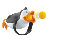 The Penguins Regurgitating Launcher is Rico penguin! He launches foam balls. Pull on his legs, hear him squawk, and watch those popcorn balls fly! Rico is a plastic launcher with sfxs. Pull back on his legs to activate SFX. Rico opens his mouth, sfx is played and a ball is launched when you push is feet forward. Rico's mouth closes after ball is launched. Force feed Rico through the mouth to get the balls back inside his tummy ready for another launch. Rico can stand up when not in launch use. Rico can hold 3 balls but comes with 5 total