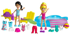 Polly™ doll and her friends are ready for fun in the sun! They can splash in the pool, dry off with a towel and soak up the sun on lounge chairs. Additional fashions and piece-count, such as sunglasses, a beach hat and a beach ball, support the theme. Ages 4 and older. X1452 Assortment.