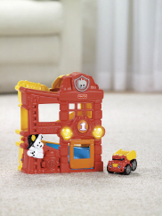 Full of action and rescue fun, the Racin' Ramps Firehouse let's baby race to the rescue! When baby puts a firetruck on the top of the ramp, it zooms down the station for a fun, action-packed ride. As the vehicle travels down the ramp it activates two flashing lights, fun sound effects and rescue tunes. Baby can also press the firehouse Dalmatian to hear rescue tunes and sounds. Includes a firetruck with roller ball for additional bat-at play.