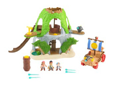 Now kids can be part of the action and adventure in this key location in Never Land where Jake and his pirate crew live. Place the magical tiki onto any one of the 3 "X" spots on the playset. Press the tiki button and watch the magical action begin as the tiki magically powers the hideout's features. Place the tiki on the X button on the front balcony and watch the hideout transform as the palm trees spread apart revealing the hideout’s secret front entrance as two second floor doors fold down, opening up the playset. Place the magical tiki on the left X button on the base of the playset to make the crow’s nest rise and lower inside the hideout and out through the top to keep a lookout for Captain Hook. There is also a balcony with a spyglass to keep a closer eye on any sea vessels that happen to pass by. Jake can man the cannon to defend the hideout from Hook and his scallywag crew. Place the magical tiki on the right X button on the base to make Tick Tock Croc chomp around as he circles the pond. Jake can climb up the ladder in the back and slide down the wooden slide to make a quick getaway. Includes working cannon with projectile “water” balls, poseable Jake figure, and magical tiki.