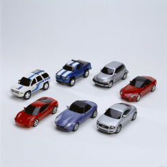 These high-performance R/C vehicles have realistic styling and rubber tires. Each one comes in a cool can with a full-function transmitter in the lid.