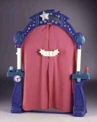 The Starlit Stage is a classically styled performance stage for your preschooler. There is a pull back curtain which activates the lights, laughter and applause when opened or closed for children to make a "grand entrance" or "encore" over and over! Features include: Light up star and smaller blinking stars, built in electronic sounds, a blow molded microphone, 4 tickets with dispenser, a clock and show sign clip. Lights shut off after 1-2 minutes.