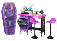 Hands-on experience is the best method for educating ghouls, so their classrooms offer lots of opportunity for claws-on learning. When you enter Home Ick™ class, you enter a kitchen with killer style. The coffin-shaped fridge, with its four shelves, is the perfect place to store ingredients and finished products. Open the clear door with its etched Monster High® logo to grab a beaker of goop or jar of pickled eyeballs. Use the counter to set ingredients, the mixing bowl, utensils and open recipe book (molded on its stand) while working. Tools fit on the Monster High® dolls' hands (dolls sold separately). “Wash” dishes in the sink with its dragon-shaped spout while the eyeball bundt cake bakes in the oven (also featuring a working door). Set the mouth-watering treat on its stand to admire and serve when done. Have a seat in one of two tall stools to taste - and grade - the spooktacular results. Monsteriffic touches include web-shaped burners, Skullette®-shaped “knobs” on the oven and web details on the stools. It'll be grade-A cooking for sure! Set includes the stove with counter top and sink, coffin refrigerator, two stools, one recipe book on stand, one pitcher of goop, one jar of pickled eyeballs, one boiling pot of goop, one egg carton, one mixing bowl, two cooking utensils, one eyeball cake on stand and one eyeball cake bundt pan. Dolls are sold separately