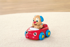 Wheeee! Roll Puppy along in his sweet ride to activate learning sounds and phrases. Baby will learn about letters, greetings, opposites and more. Spin the car wheels to hear an ABC song. Shake Puppy to hear rattle sounds, too!