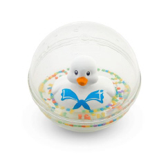 A happy white duck in a sailor suit floats inside a big, clear plastic ball, encouraging teeny-tiny ones to bat at and roll the ball – then crawl and chase after it as they grow. This floaty little friend really keeps the fun rolling, from newborn to toddler! It's just the right size for little hands to grasp, with colorful confetti that swirls around inside to entice baby to shake it up! Where development comes into play