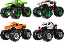 Bring home the action of Monster Jam® with sets of four licensed and authentic 1:64-scale Hot Wheels® Monster Jam® trucks! Their die-cast bodies team up with oversized mega monster tires featuring 4-wheel turning action.