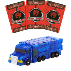 Mecard™ is a new head-to-head action battle game based on a popular animates series. Now kids can play out Mecard action in real life with their own collection of Jumbo Mecardimals that they push over "magical" cards to instantly transform their vehicles into fantastical battling warriors! Each Mecardimal has a distinct faction color that's revealed when you peel off the Mecardimal's sticker – red, blue, or black. After landing on the card and transforming into a warrior, the Mecardimal holds up the card to display three different point values. Collect the points on the card that correspond with your Mecardimal's faction color. The player with the highest points wins the card. The first player to win 3 cards wins the game! Includes one powerful purple game card and two regular game cards. Bring on the Jumbo-sized action!