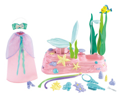 Forever Hair Ariel Salon is the place Ariel goes to get ready for a big date with Prince Eric. The spa features a clamshell salon chair that moves up and down. There is a real working shower that activates the two color-change hair extensions that are included. Also included is a glittery fashion so when Ariel doll’s hair is perfect, she can change into a beautiful mermaid gown for a date with Eric. Includes lots of accessories for styling Ariel doll. Doll not included.