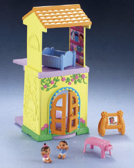 The Nursery addition celebrates Dora becoming a big sister. This addition connects to Dora's Talking House to expand the dollhouse play. Included are Dora's sibling brother and sister, a crib, a changing table and an art easel. Bilingual phrases and sounds bring the entire playset to life.