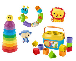 Includes 5 classic toys: Baby’s First Blocks, Snap-Lock® Caterpillar, Stack & Roll Cups™, and 2 Rainforest™ Bath Squirters