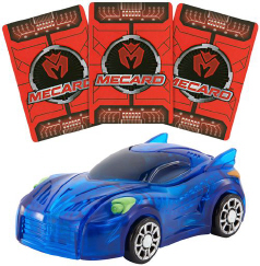 Mecard™ is a new head-to-head action battle game based on the popular animated series. Now kids can play out Mecard action in real life with their own collection of Deluxe Mecardimals. Push your Mecardimal over "magical" cards to instantly transform from vehicle into fantastical battling warrior! To play the game, first peel off the sticker to reveal your Mecardimal's faction – red, blue or black. Then collect the points on the card that correspond with your Mecardimal's faction color. The player with the highest points wins the round! Includes one Deluxe Mecardimal and three game cards. Colors and decorations may vary.