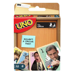 It's the UNO® matching card game everyone loves, but in a special edition featuring characters and settings from the incredibly popular TV series The Office. Players won't have to survive small office boredom using sarcasm and hilarious pranks, but they will try to get rid of all the cards in their hand. And if you're not quick, you may end up drawing card with the "Kevin's Famous Chili" rule! Gameplay is the same as classic UNO® with players matching colors and numbers as well as throwing down wild cards and penalty cards to trip up their opponents. When they're down to one card, they have to shout like they just got a bonus, "UNO!"