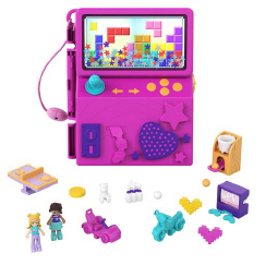 Get ready for video gaming fun with Polly Pocket™! Perfect for play at home or on the go, this Video Game Arcade compact features a gaming arcade theme and has an exterior video game arcade design and a window with shakable glitter. Compact interior includes 5 surprise and delight features, 12 Pop™ & Swap™ accessories, 2 dolls and 1 fashion accessory. Discover and play out the storytelling fun by discovering and playing with all the fun features and accessories! Some of the accessory pieces have a Pop & Swap™ peg feature so kids can plug them into different areas of the compact for endless play possibilities! The compact also comes with a wristlet strap so kids can take it on the go for fun Polly Pocket™ adventures anytime, anywhere! Colors and decorations may vary. Makes a great gift for ages 4 years old and up.