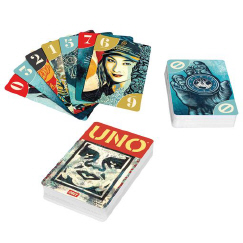 The fourth offering in the special UNO® Artiste Series features the distinctive bold style of "Obey" street artist Shepard Fairey. With contemporary graphics and intricate designs, Fairey's art has reached everyone from skateboarders to presidents, inspiring fine art to activism. This special edition of the UNOÒ game features his art on every card as well as four special, two-sided cards that when put together create two different art pieces. It's a game time masterpiece! Just as important – this deck is fully recyclable, with everything made from paper. In celebration of this special deck, Mattel has donated to Ocean Conservancy, a favorite cause of the artist. Game play is the same as the classic version. Makes a great gift for anyone 7 years or older, especially art fans and collectors.