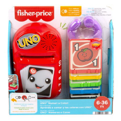 Baby can join in on the family game night fun with the Laugh & Learn® Counting and Colors UNO™ toy from Fisher-Price®! This baby-sized UNO™ "game" comes with 5 cards for little players to slot into the reader to see it light up with fun music, sounds and phrases introducing the numbers, colors and objects on each card. And with a convenient ring to link the cards together, you can easily take baby's favorite "game" along wherever you go!Use the globe button to select a language: Italian, Castilian Spanish, Portuguese or English.