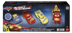 Ready, set, GLOW! Disney and Pixar's Cars star Lightning McQueen, his Radiator Springs crew and other Piston Cup racers are in a vibrant new race! Each die-cast metal Glow Racers vehicle features glow-in-the-dark coloring, providing a fun and bright storytelling or racing playtime experience. This glowing 4-pack includes Lightning McQueen, his best pal Mater, Cruz Ramirez and next-gen rival, Ryan 'Inside' Laney. Kids can collect all the glow-in-the-dark vehicles and playsets to light up playtime (each sold separately, subject to availability). Makes a great gift for Cars fans ages 3 years and older. Colors and decorations may vary.