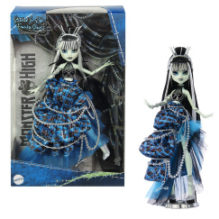 This Monster High™ doll is stitched together in a look that electrifies! Stitched in Style Frankie Stein™ stuns in a deconstructed couture gown that celebrates the art of dressmaking. Draped in silvery chains from head to toe, she is the epitome of high-voltage fashion. Plus, premium packaging and a doll stand make Frankie Stein™ doll perfect for an electrifying designer display! Fully articulated. Certificate of Authenticity included. Doll cannot stand alone. Colors and decorations may vary.