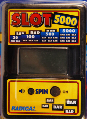 Congratulations! The RADICA SLOT is the perfect pocket companion and plays like a casino game! When playing SLOT, a single button allows you to start the game, bet 10 points, ans pin the reels. A starting score of 400 points will automatically be restored if the score reaches zero. A maximum score of 9999 can be achieved. If your score is higher than 999, for example: 10050, the display will be 0040 (internal score: 10050), the leading zero represents overflow on the display.
