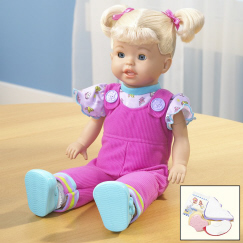 Girls will love caring for, nurturing and playing with their very own Little Mommy™ Play All Day™ Toddler doll. She is the only realistic playmate girls will adore spending time with while making discoveries. She sings, makes sounds, moves and says over 30 phrases! Includes snack play accessories like peanut butter and jelly sandwich and milk inspired by real Fisher-Price® products. When you play with the Play All Day™ Toddler doll and Play All Day™ Activity Center together, she reacts with adorable sounds and arm movements, engaging with playset for even more fun simple surprise play!