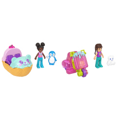 Beep beep! Polly doll and her friends are always on the go, so drive in and join the fun with this Polly Pocket vehicles set! The popsicle bike and ice cream sundae boat each include one micro doll and pet for the ultimate steering adventure. Dolls can bend to sit in the driver's seat while pets enjoy the ride in the passenger seat the cutest companions! Adorable dessert-theme details on the die-cast vehicles make them sweet to play with and fun to collect. Makes a great gift for ages 4 years old and up, especially those who love toy cars and playing with friends. Subject to availability. Colors and decorations may vary.