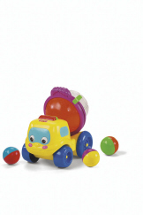 The Spin & Spill Cement Truck creates fun for baby with a new ways to play! This friendly truck comes with three (3) 2-color balls that have rattle beads inside. When baby presses the lever or bats at the drum, the balls tumble and rattle in the cement mixing drum! When baby tips the drum, the balls are dumped out and are ready to be filled again. As baby pushes the truck along, there's a great clicking sound to really get the action going! The Spin & Spill Cement Truck's friendly eyes go up and down when rolled.