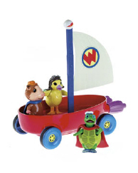 The Wonder Pets Flyboat is the iconic vehicle from the show, which they use to fly to and from every rescue. Just like on the show, when the child rolls the Flyboat, it will activate music and lights. The Flyboat also plays the Wonder Pets' theme song and is filled with signature character phrases too. The child can also activate the lights and phrases by pressing a button. It includes all 3 Wonder Pets figures, each are removeable and have a bobbling action.