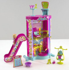 Design and build your perfect shopping destination for Polly™! Shop and play in the multi-level, light-up courtyard with an escalator to a cool second floor boutique, or hang out on the top floor food court! There's a disco/dance club with dance floor and DJ table on the first floor. Start here, and add more favorite shops, sold separately. Polly™ doll included.