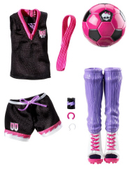 Go team! Even monsters love to play sports and at Monster High™ school spirit takes on a decidedly different twist! Basketball is casketball, cheerleading is fearleading, and football is played with an actual foot. Monster High™ has the hottest fashions to look “killer” on the field! Frankie Stein™ is the newest member of the fear squad with her stitched-together fearleading dress and Skullette™ megaphone. Clawdeen Wolf™ is sooo fast and the star of the soccer team rockin' her platform sneakers, legwarmers and uniform. Lagoona Blue™ “shreds” the waves on the school surfing team—and when the water gets a little rough she occasionally gets a “chomp” taken out of her board. Deuce Gorgon™ is the star casketball player sporting his cool sunglasses and scale print sneakers and socks. Includes team uniform and sport piece-count.