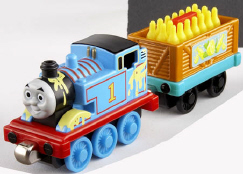 A 2 Pack including a durable die-cast engine and cargo car right from Thomas & Friends. Thomas has to pull fizzy lemonade but as he bumps and hurries along, the caps go "POP" and spill lemonade all over Thomas. Relive this adventure at home with a die-cast metal Thomas with spilled lemonade deco and a cargo car of lemonade containers. Connects either way to Take-n-Play die-cast vehicles. Collect them all.