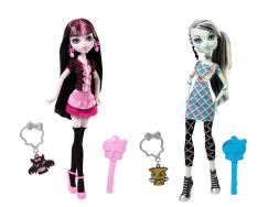 The classrooms of Monster High® are where freaky fabulous fun begins! Frankie Stein® and Draculaura® are the coolest ghouls at school with their fashions, accessories and scary cute pets. Ages 6 and over.
