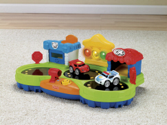 There is plenty of chasing, racing and crashing action for baby with the Chase & Race Town! With two speeds and three spinning discs, baby can drop the vehicles into either the Police Station, Gas Station or directly onto the spinning traffic circles to watch the cars spin, jump from disc to disc and crash into each other! Chase Around Town has fun car sounds, music, put-and-take activities, and three flashing lights! The action packed town comes with two Lil' Zoomers rattle cars for added fun and excitement.